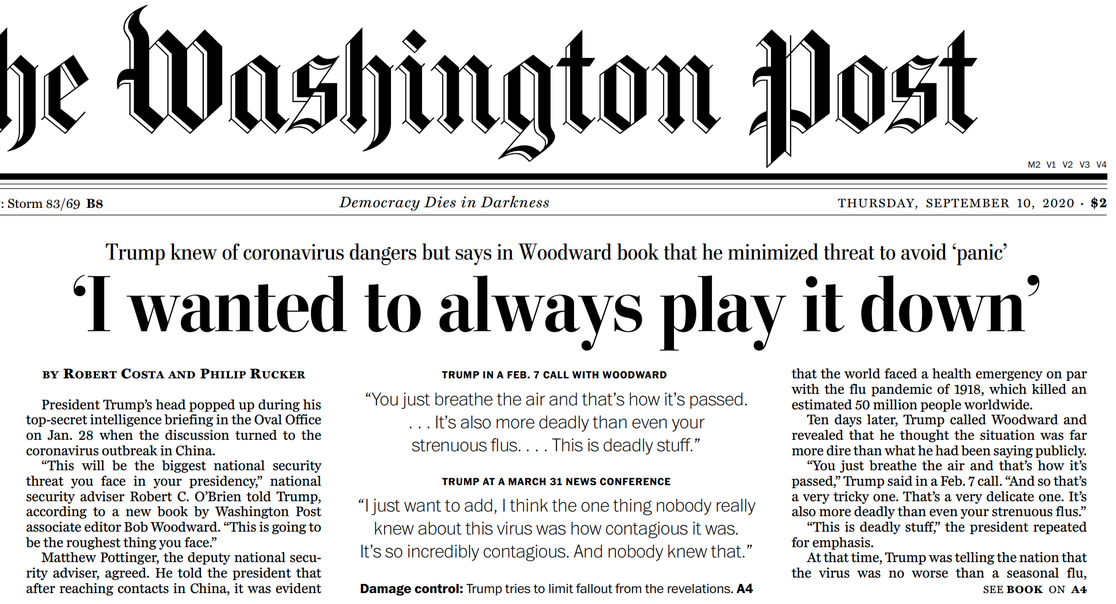 Woodward knows the power of tapes, and of the word "cover-up." On the forthcoming "60 Minutes," Scott Pelley asks Woodward about Trump telling him in February that the virus was "more deadly than ... even your strenuous flus," while saying publicly three weeks later that "it's a little like the regular flu." - "Yes, this is the tragedy," Woodward says. "A president of the United States has a duty to warn. The public will understand that. But if they get the feeling that they're not getting the truth, then you're going down the path of deceit and cover-up." (Vide0)