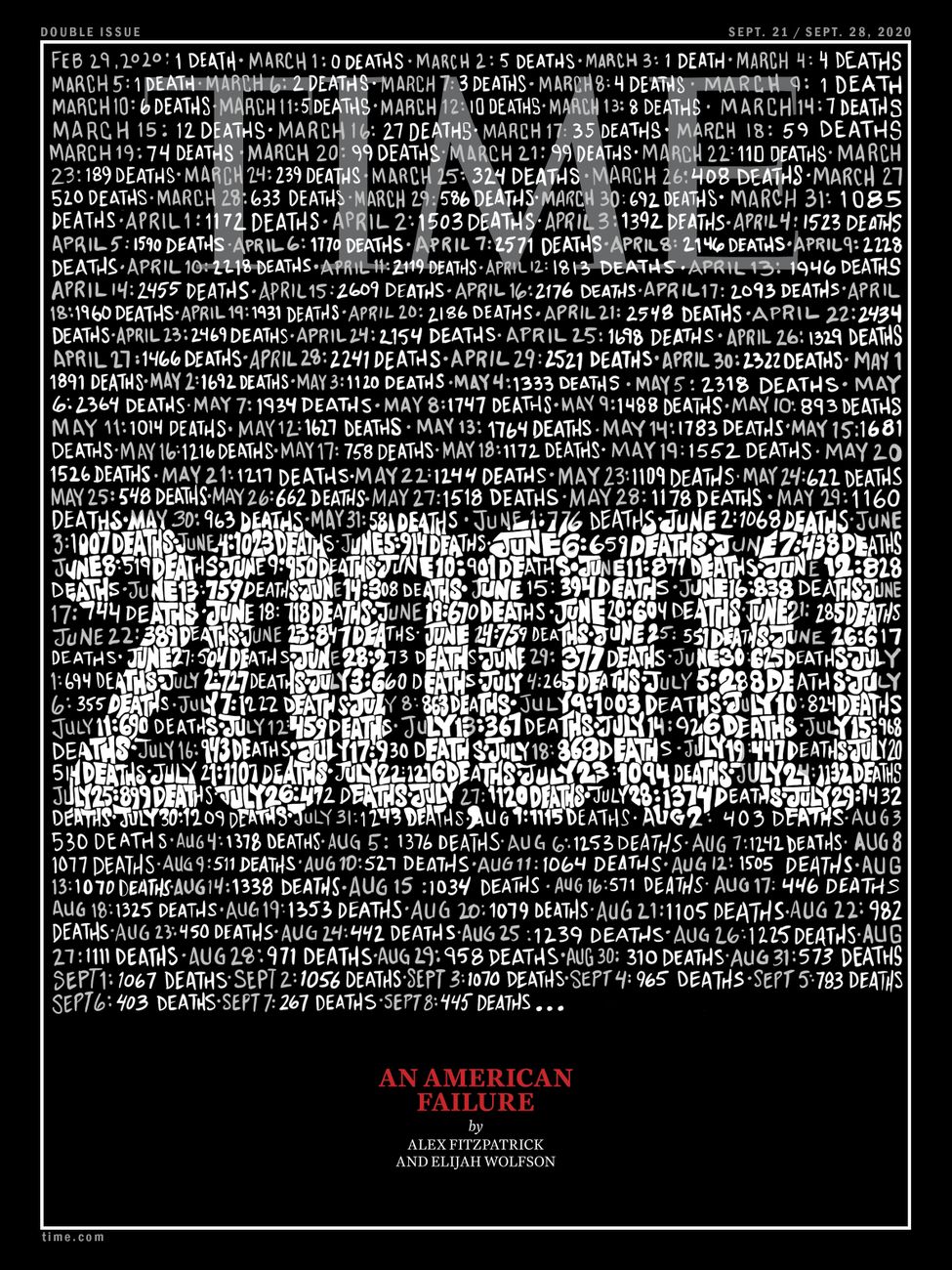 In Salem, Ore., smoke darkens the sky well before sunset, around 5 p.m. Tuesday. Photo: Russ Casler via AP Highway 162 as the Bear Fire burns in Oroville (Butte County, Calif., yesterday. Photo: Noah Berger/AP | | | | 5. "A devastating milestone" | TIME editor-in-chief and CEO Edward Felsenthal: "For this week's U.S. cover, we turned to artist John Mavroudis, who — using data from the Johns Hopkins Coronavirus Resource Center — hand-wrote the death counts in America on every one of the 193 days between Feb. 29, the first confirmation of a COVID-related death in the U.S., and Sept. 8, as it neared time to go to press." - "Out of that data, the illustration reveals the coming grim milestone of 200,000." (Latest U.S. death count: 190,872.)